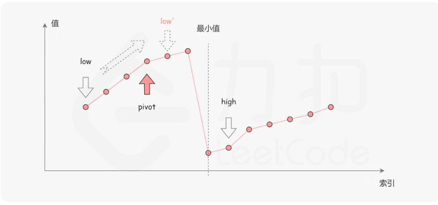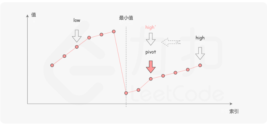 在二分查找的每一步中,左边界为 low,右边界为 high,区间的中点为 pivot,最小值就在该区间内。我们将中轴元素 nums[pivot] 与右边界元素 nums[high] 进行比较,可能会有以下的三种情况: