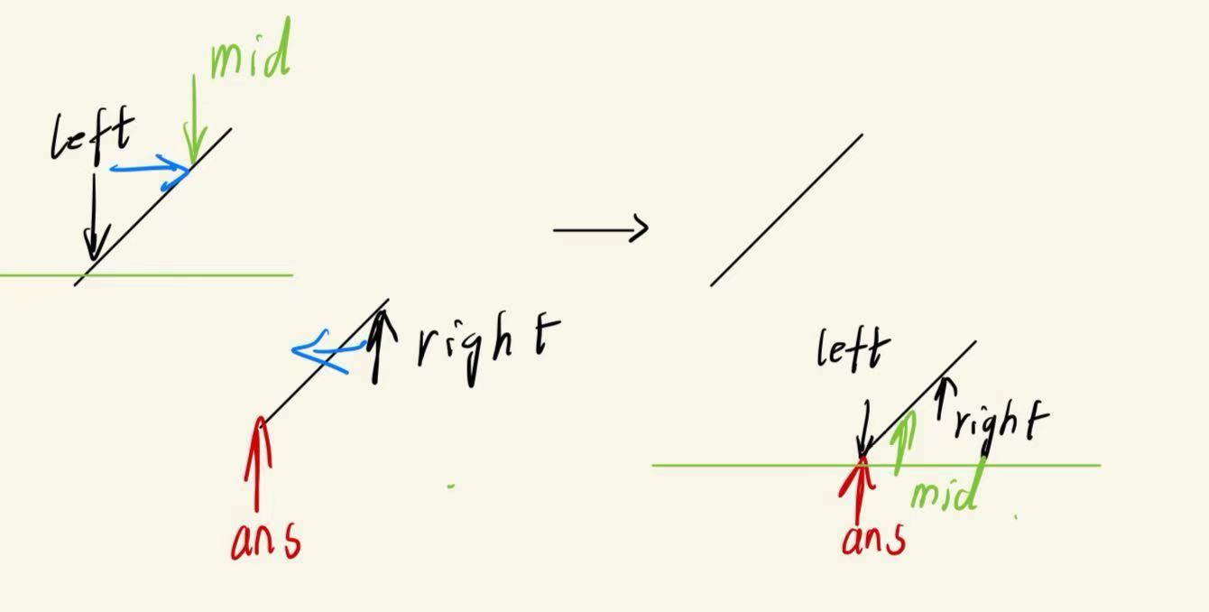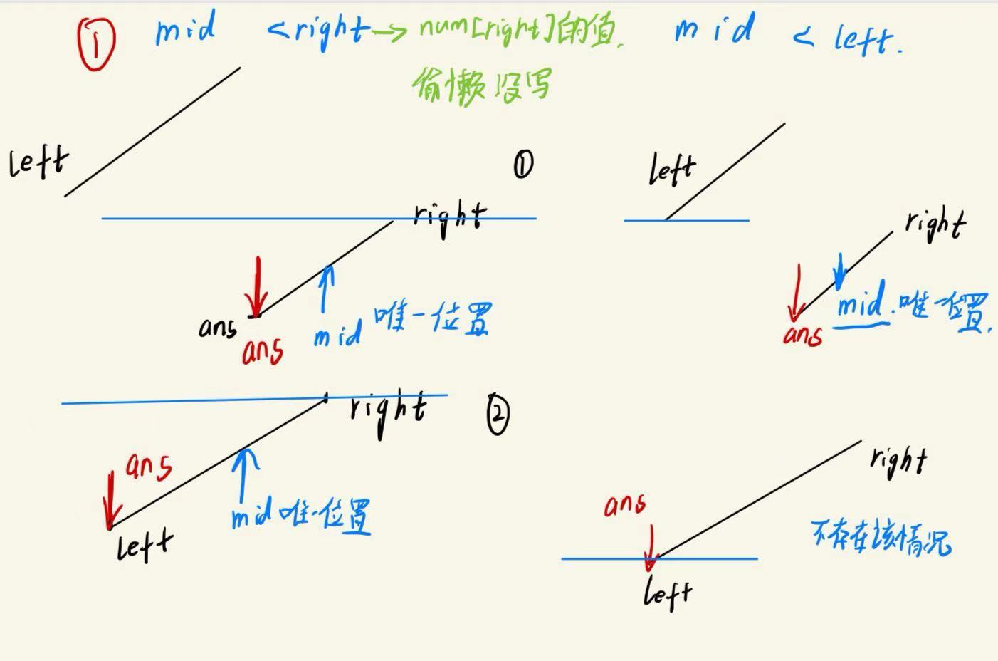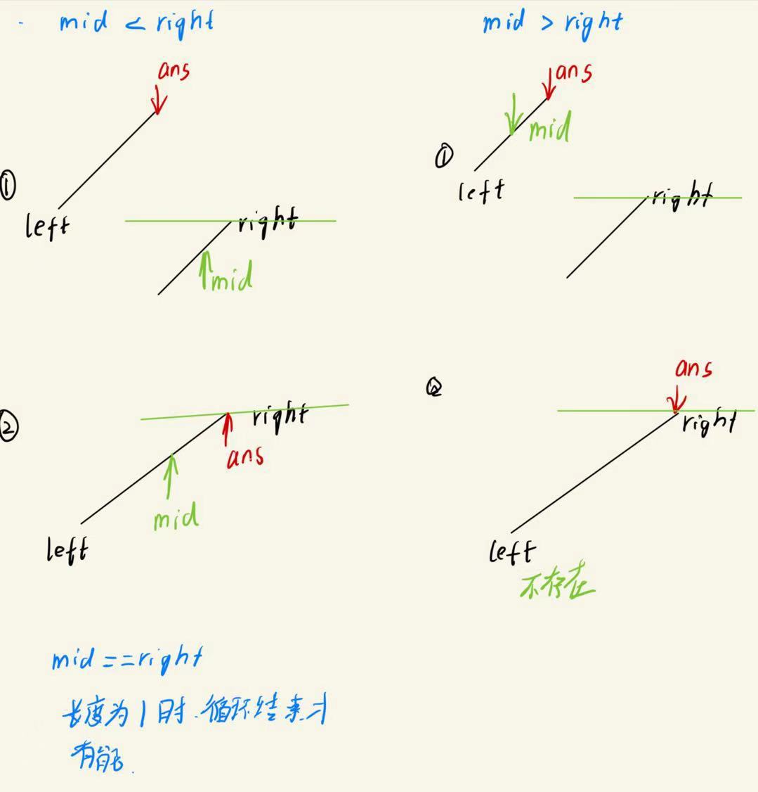 会发现,在不同的情况下,mid相对于ans的位置前后关系不同,并且情况一在一次次递归后可能变为情况2,如图所示: