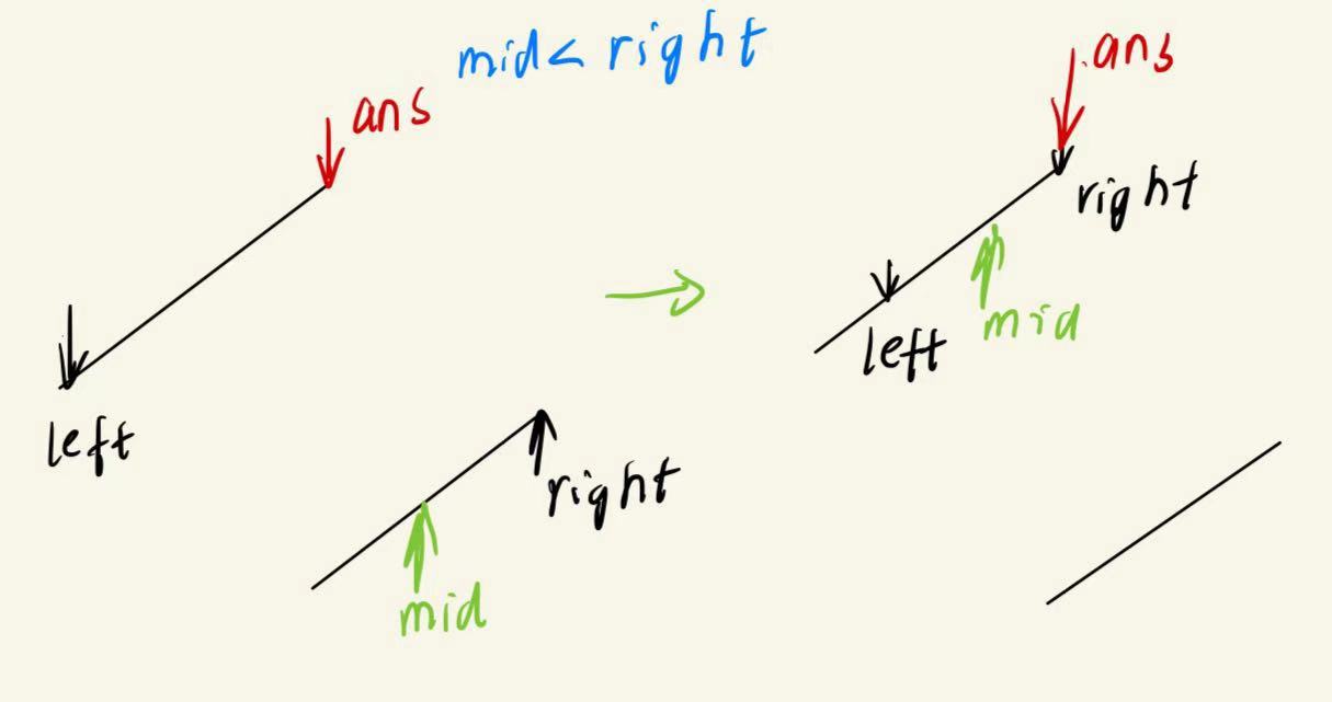 我们发现在nums[mid]<nums[right]时,ans与mid有两种相对位置